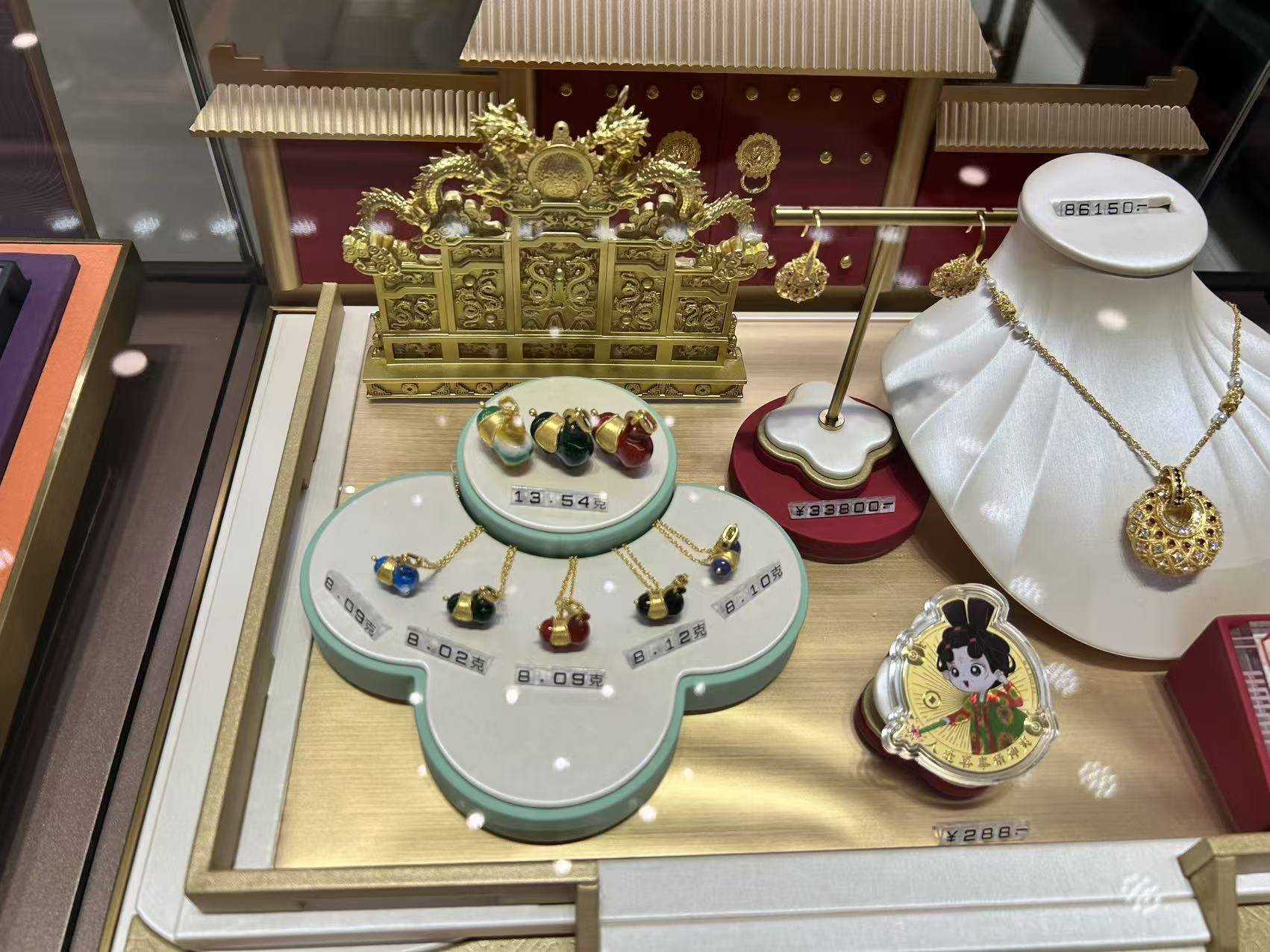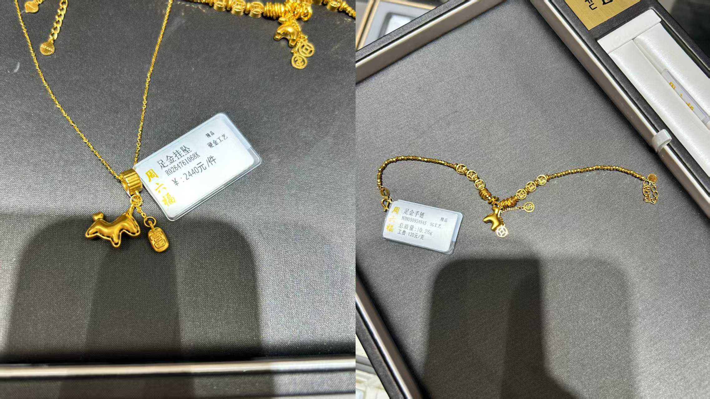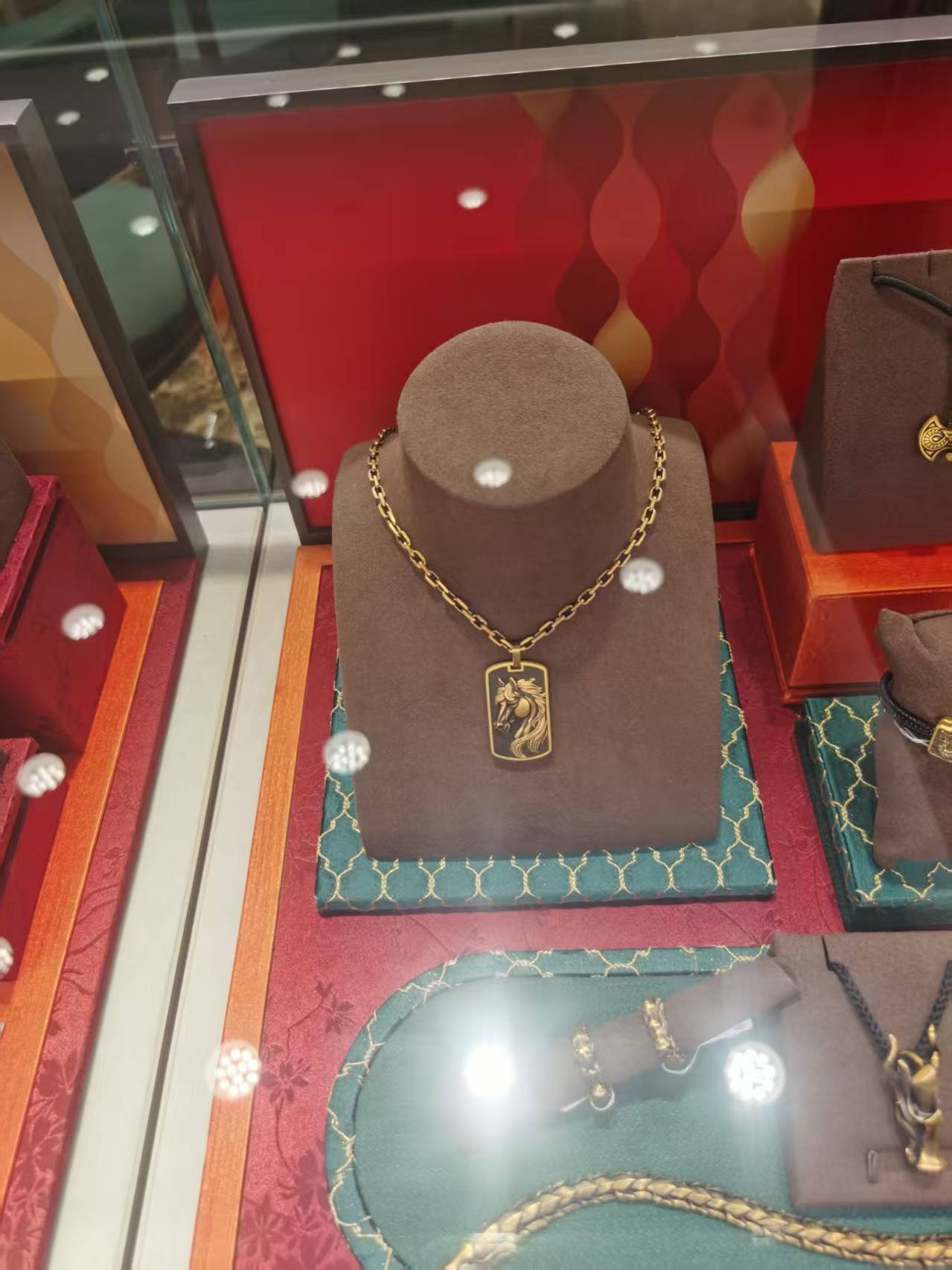 周六福柜面店员则拿起挂有“钱币”和“富”字样金片的钱马奔腾系列挂坠和手链,展示给记者看。此外,六福珠宝还特别推出了“唐宫夜宴”联名的珐琅工艺唐彩墩墩马系列金链,在设计上兼顾了文化底蕴与潮流时尚。